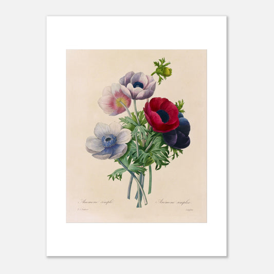 Anemone Coronaria ist eine Illustration, die die zarten Details dieser farbenfrohen Blume mit großer Finesse einfängt. Pierre-Joseph Redouté, der berühmte botanische Illustrator des 18. Jahrhunderts, bringt in diesem Werk seine außergewöhnliche Fähigkeit zum Ausdruck, die Lebendigkeit von Blumen darzustellen.