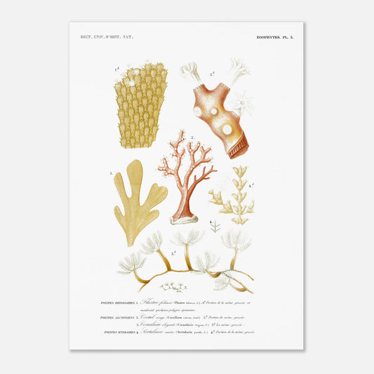 Gravurreproduktion von: Blattkoralle (Flustra foliacea, Lin.), Rote Koralle (Corallium rubrum, Lamk.), Elegante Kornblume (Cornularia elegans), Zwerg-Sertularia (Sertularia pumila, Lin.)