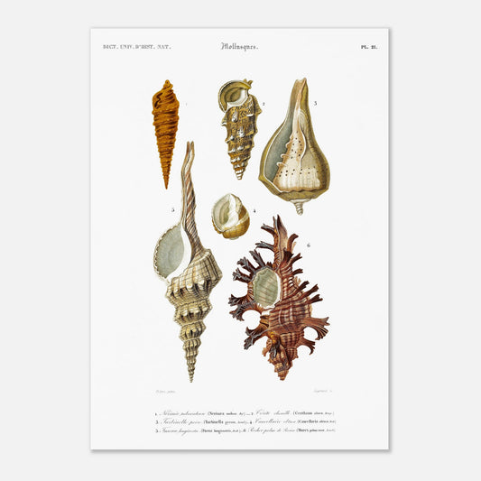 Reproduktionsgravur von: Obtuse cancellaria (Cancellaria obtusa, Desh.), Birnenturbinella (Turbinella pyrum, Lamk.), Longirostris-Spindel (Fusus longirostris, Desh.), Tuberkulöse Nerine (Nerinea nodosa, Def.), Cerith-Raupe (Cerithium aluco, Brug.), Rocher Palme-de-Rosier (Murex palma-rosae, Lamk.)