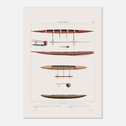 Bewundern Sie diese authentische Darstellung der Tafahanga- und Boopaa-Kanus, die François Edmond Pâris während des Zwischenstopps in Tonga Tabou während der Reise der Astrolabe verewigt hat. Diese ikonischen Schiffe spiegeln den Einfallsreichtum der Archipelbewohner wider und vereinen Ästhetik und maritime Leistung. Das Tafahanga-Kanu zeichnet sich durch seine Finesse und Geschwindigkeit aus und ist ideal für schnelles Reisen, während das robustere Boopaa für den Transport schwerer Lasten ausgelegt ist. Jedes Element, von den komplexen Verankerungen bis hin zu den kunstvollen Verzierungen, veranschaulicht die außergewöhnliche Handwerkskunst der Tongaer und zeugt von einer maritimen Tradition, die tief in ihrer Inselkultur verwurzelt ist.