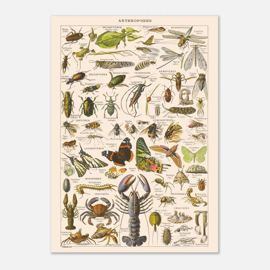 Découvrez cette planche ancienne consacrée aux arthropodes, tirée de l’Encyclopédie Larousse pour tous publiée en 1910. Elle présente avec précision une grande variété d’espèces fascinantes, pour ne citer qu’eux : homard, scolopendre, abeille, libellule, blatte et mygale, chacune restituée avec le soin naturaliste caractéristique des planches pédagogiques de l’époque. Chaque détail illustre la diversité et la complexité de ce vaste groupe animal.