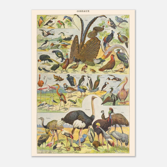 Plongez dans l’univers varié des oiseaux avec cette planche ancienne tirée de l’Encyclopédie Larousse pour tous publiée en 1910. Elle rassemble une grande diversité d’espèces, comprenant martins, canards et autres faisans, lyres, ainsi que des oiseaux plus exotiques comme flamants, manchots, pélicans, sans oublier autruches, émeus et spatules. Chaque espèce est représentée avec une précision naturaliste et une finesse graphique qui rendent hommage à l’art des illustrateurs de l’époque.