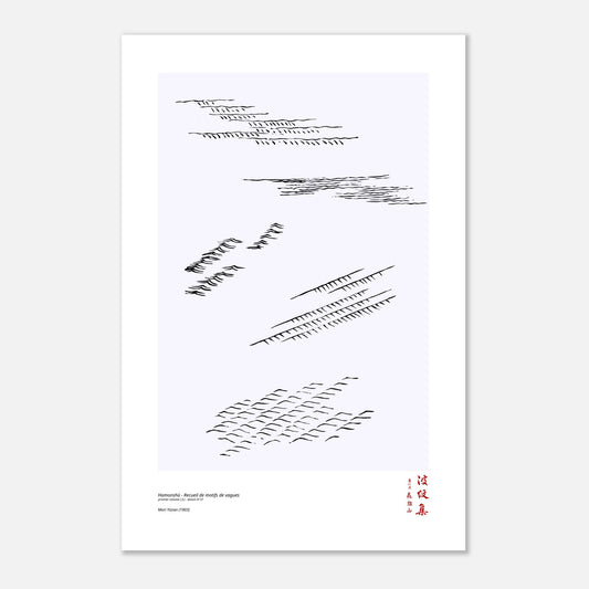 Verschönern Sie Ihr Interieur mit dieser Reproduktion der Zeichnung Nr. 31 aus dem ersten Band (上) des Hamonshū , einer ikonischen Sammlung aus dem Jahr 1903 von Mori Yūzan. Das Werk, auf Japanisch (波紋集) „Sammlung von Wellenmustern", beleuchtet ein zentrales Thema: die fließende und harmonische Bewegung von Formen, inspiriert vom Wasser. Es dient Kunsthandwerkern als Orientierungshilfe für Ornamente und bietet eine Sammlung einzigartiger Muster, die Abstraktion, Landschaftsbilder und poetische Kompositionen vereinen.