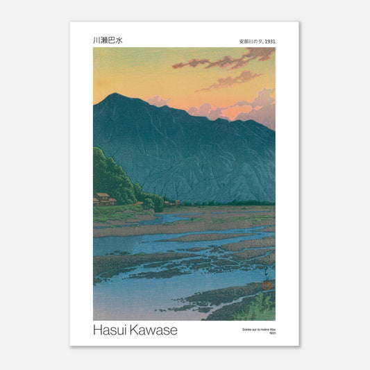 Reproduktion des Drucks „Evening on the Abe River" von Hasui Kawase aus dem Jahr 1931 (Originaltitel: „安部川の夕")