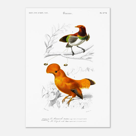Gravurreproduktion von: Hahn (Pipra rupicola, Gmel.), Manucaude (Paradisaea regia, Gmel.)