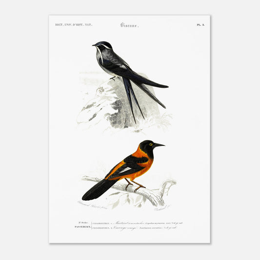 Gravurreproduktion von: Bartsegler (Cypselus mylaccus, Less.), Orangestirnstärling (Xanthornus aurantius)