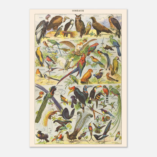 Découvrez cette planche ancienne consacrée aux oiseaux, tirée de l’Encyclopédie Larousse pour tous publiée en 1910. Elle présente une grande variété d’espèces, allant des rapaces majestueux aux perroquets colorés et autres oiseaux tropicaux, chacune illustrée avec un soin naturaliste et une précision remarquable. Les détails des plumes et des postures mettent en valeur la diversité et la beauté du règne aviaire.