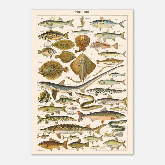 Découvrez cette planche ancienne consacrée aux poissons, tirée de l’Encyclopédie Larousse pour tous publiée en 1910. Elle illustre une grande diversité d’espèces marines et d’eau douce, parmi lesquelles harengs, truites, carpes, esturgeons, brochets, squales, raies, torpilles ou encore thons, toutes représentées avec une précision remarquable et un rendu naturaliste fidèle à l’esprit scientifique de l’époque.