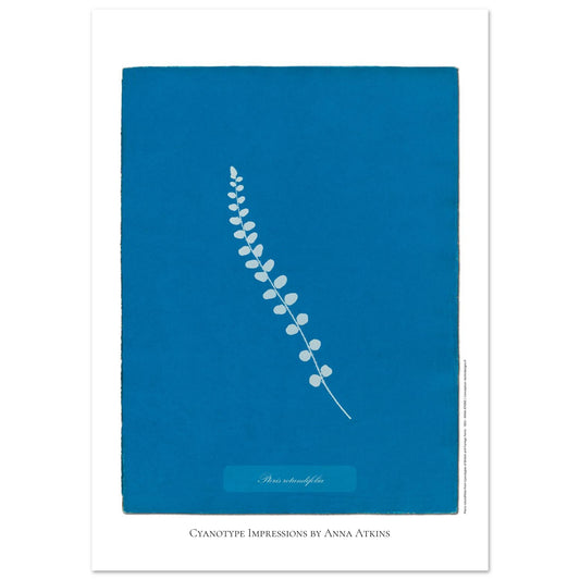 Gönnen Sie sich mit dieser Cyanotypie-Reproduktion ein Stück Geschichte und Natur. Sie verleiht jedem Interieur eine künstlerische und raffinierte Note. Perfekt für Botanik-Enthusiasten, Fans von Vintage-Fotografie oder Liebhaber wissenschaftlicher Kuriositäten – sie passt gleichermaßen gut in ein modernes Ambiente wie in ein Vintage-Dekor. Eine eindrucksvolle Hommage an das Werk von Anna Atkins und an eine der ersten Anwendungen der Fotografie im Dienste des Wissens.