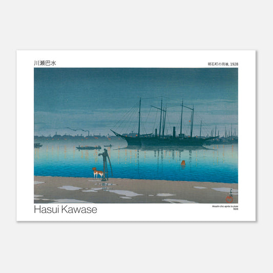 Reproduktion einer malerischen Szene, die die Harmonie zwischen japanischer Kunst und Natur zum Ausdruck bringt – Akashi-cho nach dem Regen von Hasui Kawase