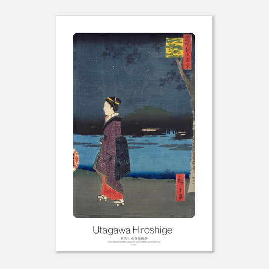 Dieser nächtliche Druck zeigt eine Geisha, vielleicht Hiroshiges Lieblingsfigur, im Profil mit strahlend weißem Make-up, das einen Kontrast zum Sternenhimmel bildet. Ihre Frisur und Kleidung zeugen von der Meisterschaft des Bijin-ga. Im Hintergrund heben sich die Lichter des Matsuchi-yama-Hügels ab, auf dem sich der Shoten-Schrein befindet. Der San'yabori-Kanal führt zum Vergnügungsviertel Yoshiwara.