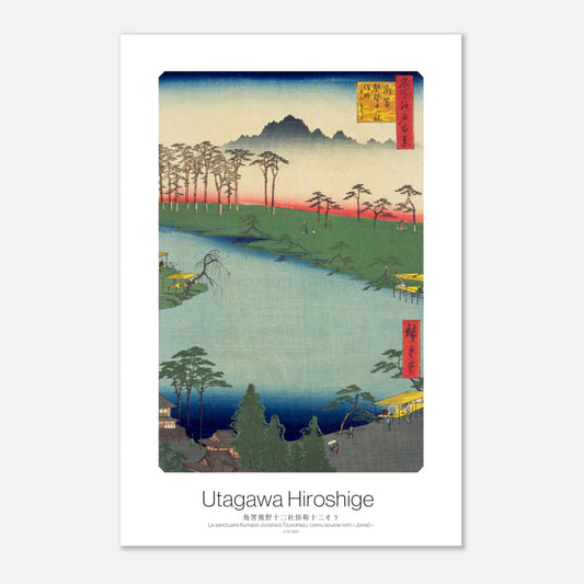 Ukiyo-e-Poster, das die zerbrechliche Schönheit der japanischen Natur verewigt – Hiroshiges Kumano Jūnisha-Schrein in Tsunohazu