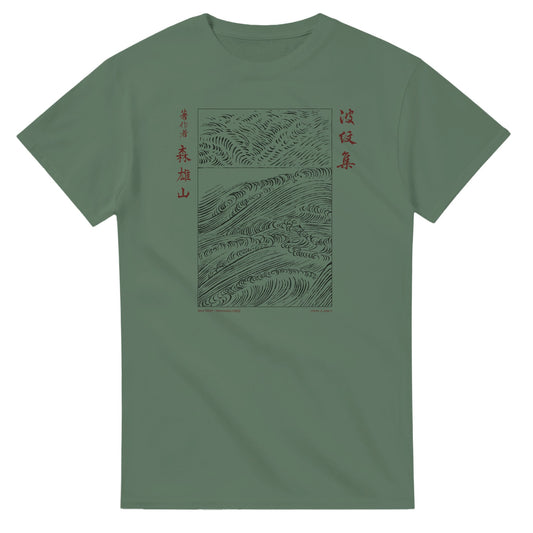 Embrace the timeless elegance of Japanese art with this t-shirt featuring an illustration from pattern No. 46 from the final volume (下) of Hamonshū , an iconic collection created in 1903 by Mori Yūzan. The original title (波紋集), literally meaning "Collection of Wave Patterns," highlights a universal theme: the fluid and harmonious movement of water and the shapes it evokes. Originally intended as a source of inspiration for artisans, Hamonshū brings together a variety of patterns, ranging from abstract undulations to figurative compositions, sometimes close to the landscape, always imbued with poetry and a refined aesthetic.