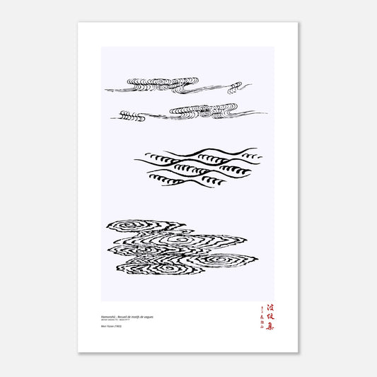 Bring the poetry of Japanese art into your space with this reproduction of motif No. 11 from the last volume (下) of the Hamonshū , the famous collection of motifs created in 1903 by Mori Yūzan. The title (波紋集), which can be translated as "Collection of Wave Motifs," highlights a universal theme: the fluidity and harmony of forms inspired by water. Intended to guide artisans, this collection is full of varied compositions, ranging from abstract waves to stylized landscapes, always imbued with sensitivity and refinement.