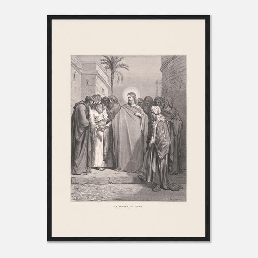 Admire this subtle work by Gustave Doré , depicting Caesar's denarius, taken from The Holy Bible according to the Vulgate (1866). The details of the coin, the expressions of Jesus and the Pharisees illustrate Saint Matthew XXII, 16 with intellectual finesse.
