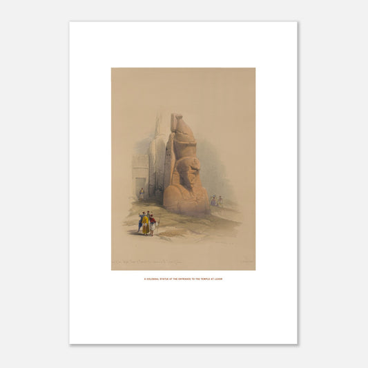 Discover the timeless majesty of ancient Egypt with our iconic engraving depicting the "Colossal Statue at the Entrance to Luxor Temple." Captured by David Roberts during his 1830 journey, this beautifully detailed work depicts two monumental granite seated statues erected in front of the great propylon of Luxor Temple. Originally standing nearly fifty feet tall, these imposing statues, though mutilated by time and violence, are a testament to the grandeur of Ramses II and the extraordinary mastery of Egyptian art at the time. The intricate details of the royal hairstyles and emblems, though partially defaced, remain a vibrant tribute to the rich culture and artistry of ancient Egypt.