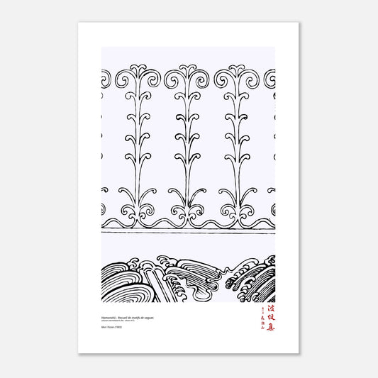 Explore the richness of Japanese art with this reproduction of drawing No. 5 from the middle volume (中) of the Hamonshū , a reference collection created in 1903 by Mori Yūzan. The original title (波紋集), literally meaning "Collection of Wave Patterns," celebrates the elegance of flowing, harmonious forms inspired by water. Designed for artisans, this collection brings together a variety of motifs, from abstract ripples to compositions evoking landscapes, always expressing visual poetry and a keen sense of aesthetic balance.