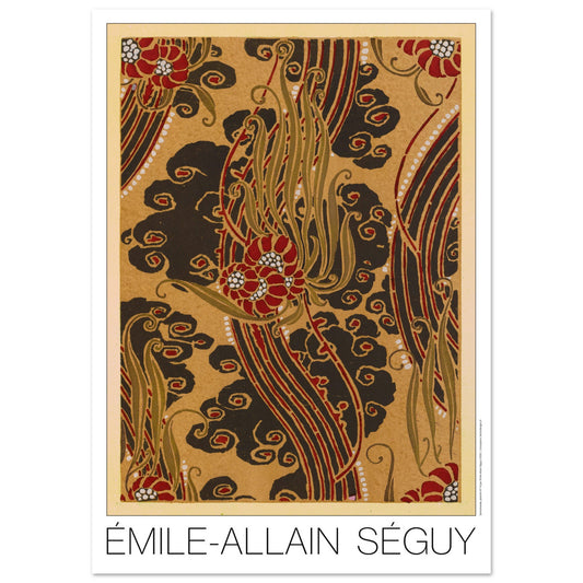 In this dynamic composition, Séguy explores an Asian-inspired graphic vocabulary against a warm golden background. Dark swirls evoking waves or clouds intertwine with red floral motifs, creating a vigorous upward movement. The artist demonstrates his mastery of Japanese influences by reinterpreting them in a resolutely modern language. The contrast between the flowing curves of the waves and the geometry of the flowers creates a fascinating visual tension. This plate embodies the excellence of Art Deco in its ability to fuse Eastern influences with Western modernity. Its powerful composition and refined color scheme make it a centerpiece for any lover of sophisticated decoration.