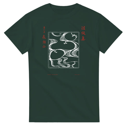 Embrace the timeless elegance of Japanese art with this t-shirt featuring an illustration from pattern No. 2 from the middle volume (中) Hamonshū , an iconic collection created in 1903 by Mori Yūzan. The original title (波紋集), literally meaning "Collection of Wave Patterns," highlights a universal theme: the fluid and harmonious movement of water and the shapes it evokes. Originally intended as a source of inspiration for artisans, Hamonshū brings together a variety of motifs, ranging from abstract undulations to figurative compositions, sometimes close to the landscape, always imbued with poetry and a refined aesthetic.