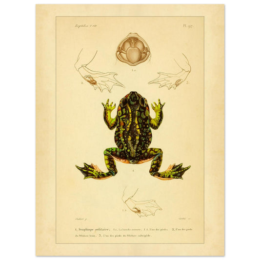 Cette reproduction convient parfaitement aux amateurs d'herpétologie, de biologie et d'illustrations naturalistes anciennes. Elle peut servir de pièce décorative instructive dans un espace de travail ou d'étude, mettant en valeur l'histoire de la découverte scientifique des amphibiens.