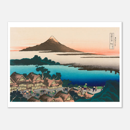Dawn at Isawa in Kai Province (甲州伊沢暁, Kōshū Isawa no Akatsuki) is a Japanese woodblock print by Japanese ukiyo-e artist Katsushika Hokusai . This work captures the beauty of a sunrise, where the first golden rays of morning gently illuminate the tranquil landscape. Mount Fuji rises majestically from behind the hills, bathed in a warm light, while the peaceful village of Isawa appears to slowly awaken under the bright sky.