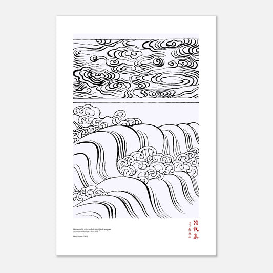 Bring the poetry of Japanese art into your space with this reproduction of motif No. 16 from the middle volume (中) of the Hamonshū , the famous 1903 collection of motifs by Mori Yūzan. The title (波紋集), which can be translated as "Collection of Wave Motifs," highlights a universal theme: the fluidity and harmony of forms inspired by water. Intended to guide artisans, this collection is full of varied compositions, ranging from abstract waves to stylized landscapes, always imbued with sensitivity and refinement.