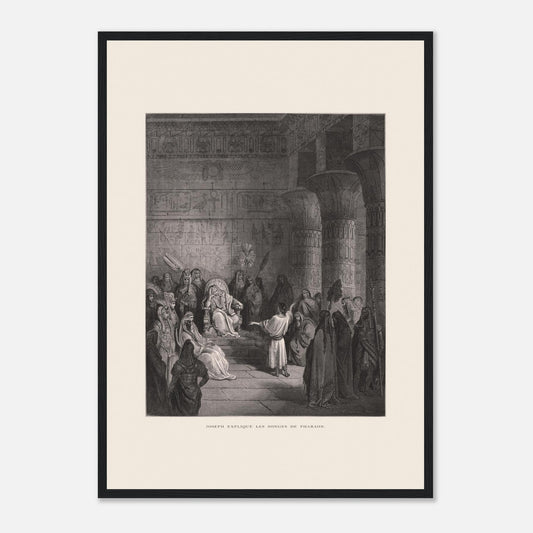 Cette estampe met en lumière le don de Doré pour les scènes narratives, où chaque détail renforce la tension dramatique et la sagesse prophétique. La référence biblique, Genèse XLI, 14, évoque la perspicacité de Joseph et la providence divine.