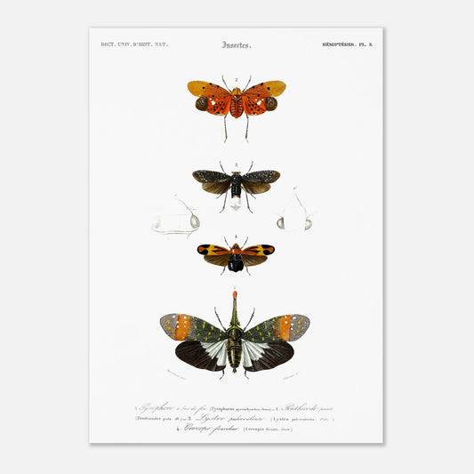 Reproduction engraving of: Fire-billed Pyrophorus (Pyrophorus pyrorhynchus, Donov.), Painted Penticode (Penthicodes picta, Blanch.), Powdery Spitweed (Lystra pulverulenta, Fabr.), Forked Spigot (Cercopis fureata, Germ.), Head of the Blood Spitput (Cercopis Sanguinolenta, Lin.)