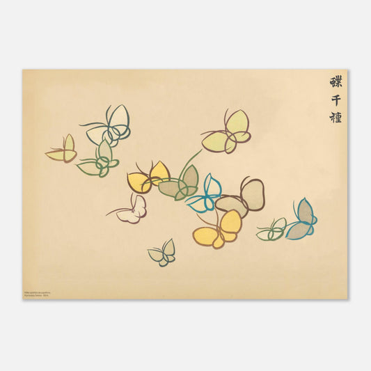 Cette gravure délicate, faisant partie de la série Mille variétés de papillons (Chō senshu) 蝶千種, met en scène une douzaine de papillons aux traits simples et aplats blancs, crème et jaunes pour le corps, tous ourlés de tons marron, vert et bleu. Les contours soignés et les couleurs douces créent une harmonie visuelle apaisante, où chaque papillon semble flotter avec légèreté. Une œuvre qui célèbre la simplicité et l'élégance des détails.