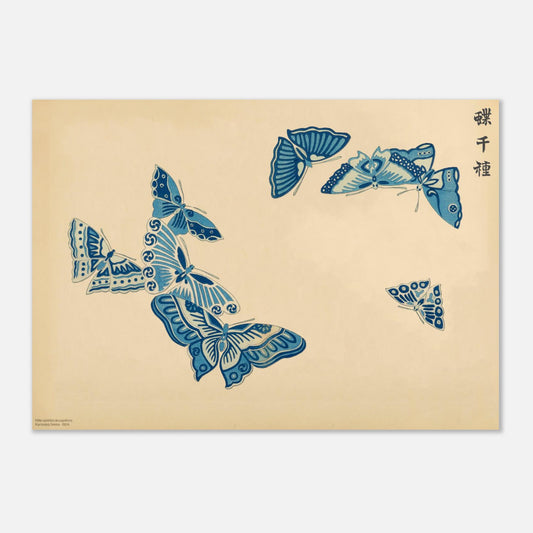 Cette reproduction envoûtante plonge les papillons dans un univers de dégradés bleus profonds et blancs cassés, rappelant les reflets changeants des azulejos et l'immensité du ciel. Tirée de la série Mille variétés de papillons (Chō senshu 蝶千種), cette œuvre illustre l'art de Kamisaka Sekka dans toute sa délicatesse. Une création qui invite à la rêverie et apporte une touche de fraîcheur à tout intérieur.
