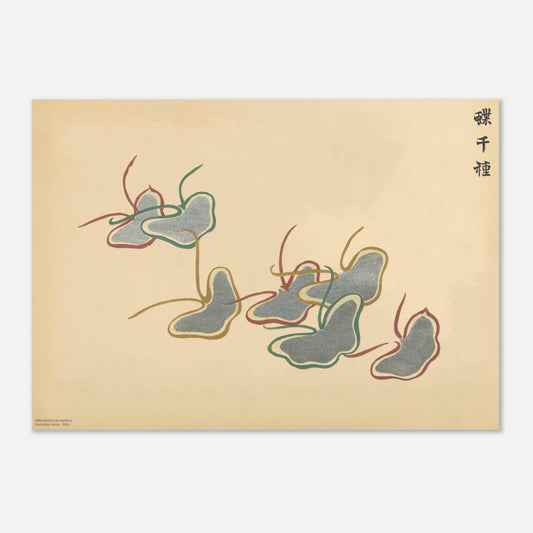 Cette gravure délicate, tirée de la série Mille variétés de papillons (Chō senshu) 蝶千種, présente des papillons très minimalistes, réduits à des taches argentées pailletées, entourées de traits et antennes unis dans des tons de vieux rose, marron et vert. Leurs formes épurées et leurs détails scintillants créent une ambiance à la fois sobre et luxueuse, typique du style raffiné de Sekka. Une œuvre qui célèbre la simplicité et l'éclat discret.