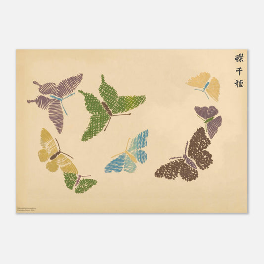 Cette gravure abstraite, extraite de l’œuvre originale Mille variétés de papillons (Chō senshu) 蝶千種, met en scène des papillons aux motifs hachurés, croisés et gaufrés, déclinés dans des tons pastels bleus, verts, marrons, mauves et jaunes. Les patterns complexes et les jeux de textures créent une profondeur visuelle fascinante, où chaque détail invite à la contemplation. Une œuvre qui allie abstraction et nature, pour un rendu à la fois dynamique et harmonieux.