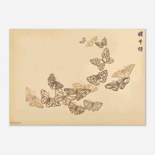 Cette gravure fascinante met en lumière des papillons dont les ailes rappellent la structure des physalis, avec des nervures détaillées et des tons marrons et beiges. Tirée de la série Mille variétés de papillons (Chō senshu 蝶千種), cette œuvre célèbre la beauté des structures naturelles et la subtilité du regard de Sekka. Une pièce d'une délicatesse rare.