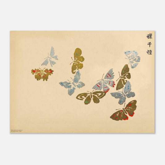 Cette estampe exceptionnelle met en valeur des papillons aux teintes texturées, enrichies d'effets dorés et argentés ainsi que de subtiles paillettes. Tirée de la série Mille variétés de papillons (Chō senshu 蝶千種), cette œuvre témoigne de l’audace artistique de Kamisaka Sekka et de son goût pour l’expérimentation. Une création qui joue avec la lumière et les textures pour un rendu presque magique.
