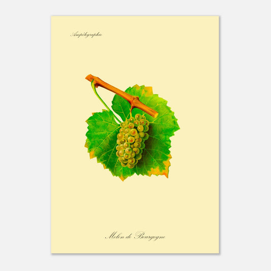 Discover the elegance of the Melon de Bourgogne grape variety through an engraving from Viala and Vermorel's Ampelography. This fine art print highlights the simplicity and finesse of this grape variety, famous for its light, mineral wines. The meticulously crafted engraving evokes the classicism and winemaking heritage of the region. Perfect for wine and art lovers, this piece celebrates winemaking tradition and adds a touch of refinement and authenticity to any space.