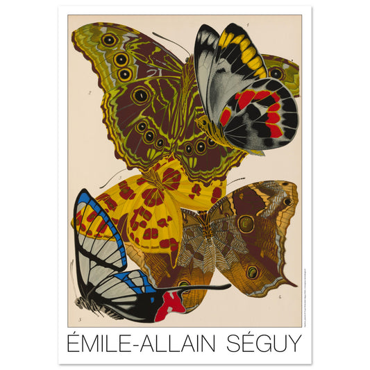 Rediscover the sumptuous world of butterflies through an elegant reproduction of a plate by Émile-Allain Séguy, master of decorative illustration. Each exotic species, selected for its refinement and rich colors, is magnified here by an exceptional enlargement, making visible the smallest details of their delicate wings. Conceived as a treasure trove for artists and design enthusiasts, this collection brings together specimens whose shapes and chromatic harmonies have inspired creators of decorative motifs for over a century. Far from a simple scientific study, these compositions are intended as a celebration of natural beauty in its purest expression. This refined reproduction is a unique piece to elegantly adorn an interior. Ideal for collectors and ornamental enthusiasts, it embodies the perfect union between art and nature.The list of species present in the board as well as their origin