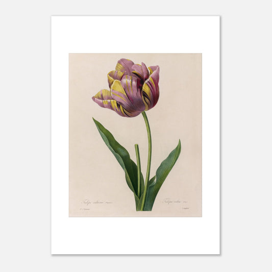 Cultivated Tulip (Variety) (Tulipa Culta) is an engraving that highlights the delicate beauty of this flower with its vibrant petals and elegant leaves. Pierre-Joseph Redouté, a famous 18th-century botanical illustrator, demonstrates his expertise in depicting the various floral shades and shapes.