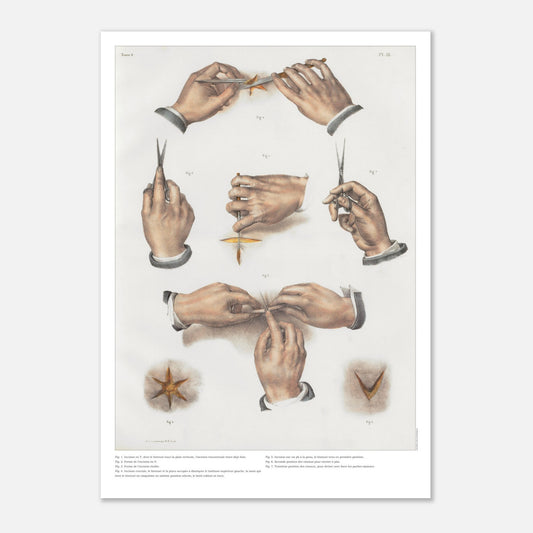 The artistry behind this plate is just as impressive as its technical content. The positions of the hands, scalpel, and scissors are rendered with meticulous precision, capturing the attention both through the aesthetics of the gestures and the surgical accuracy. The crucial incision, in particular, demonstrates a dynamic handling of the instruments that reveals the importance of manual dexterity in 19th-century surgery. The clarity of the lines and the harmonious arrangement of the elements on the plate make it a work of art as much as a teaching tool.