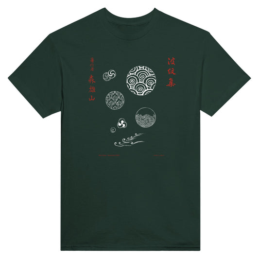 Invite Japanese art into your wardrobe with this T-shirt featuring a reproduction of pattern No. 19 from the middle volume (中) of the Hamonshū , the famous 1903 pattern collection by Mori Yūzan. The original title (波紋集), which translates as "Wave Pattern Collection," celebrates a universal theme: the fluid, organic movement of ripples and aquatic forms. Originally designed as a resource for artisans, this collection is full of diverse patterns, ranging from abstract compositions to subtle landscapes, demonstrating a poetic and timeless aesthetic.