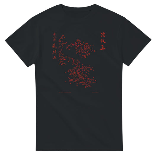 Embrace the timeless elegance of Japanese art with this t-shirt featuring an illustration from pattern No. 25 from the middle volume (中) Hamonshū , an iconic collection created in 1903 by Mori Yūzan. The original title (波紋集), literally meaning "Collection of Wave Patterns," highlights a universal theme: the fluid and harmonious movement of water and the shapes it evokes. Originally intended as a source of inspiration for artisans, Hamonshū brings together a variety of motifs, ranging from abstract ripples to figurative compositions, sometimes close to the landscape, always imbued with poetry and a refined aesthetic.