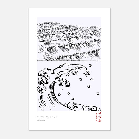 Explore the richness of Japanese art with this reproduction of drawing No. 16 from the final volume (下) of the Hamonshū , a reference collection created in 1903 by Mori Yūzan. The original title (波紋集), literally meaning "Collection of Wave Patterns," celebrates the elegance of fluid and harmonious forms inspired by water. Designed for artisans, this collection brings together a variety of motifs, from abstract ripples to compositions evoking landscapes, always expressing visual poetry and a keen sense of aesthetic balance.
