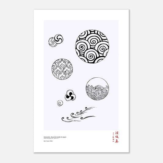 Enhance your interior with this reproduction of drawing No. 19 from the middle volume (中) of the Hamonshū , an iconic collection created in 1903 by Mori Yūzan. Entitled in Japanese (波紋集), "Collection of Wave Patterns," this work highlights a central theme: the fluid and harmonious movement of forms inspired by water. Guiding artisans in their quest for ornamentation, this work offers a collection of unique patterns, combining abstraction, landscape evocations and poetic compositions.