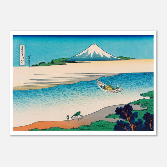 Tama River in Musashi Province (武州玉川, Bushū Tamagawa) is a Japanese woodblock print by Japanese ukiyo-e artist Katsushika Hokusai . This work captures a peaceful moment along the Tama River, with Mount Fuji looming in the distance. The still waters and the figures of fishermen in the foreground create a scene of serenity, where nature seems to gently dominate human life.