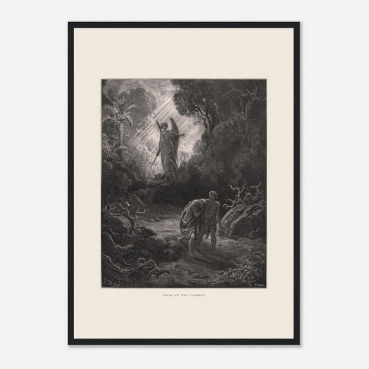 Descubra esta impactante obra de Gustave Doré , que representa el trágico momento en que Adán y Eva son expulsados del Jardín del Edén, según la Biblia Vulgata (1866). Las expresiones de dolor y resignación, junto con la exuberante vegetación del fondo, ilustran Génesis 3:23 con una intensidad dramática.