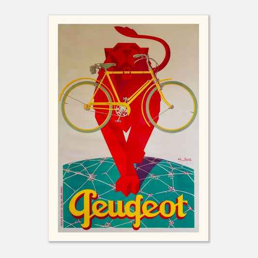 Puissante et symbolique, cette affiche publicitaire pour les cycles Peugeot, créée par Georges Favre en 1930, illustre avec brio l’audace de la marque. Un lion rouge stylisé, emblème historique de Peugeot, tient fermement un vélo jaune dans sa gueule, fusionnant force et mouvement. Le fond, traversé par un réseau de routes et de rails, souligne l’idée de mobilité et d’innovation, chères à l’identité de la marque dans les années 1930.