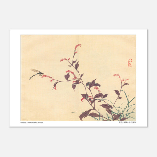 Este grabado japonés representa una libélula posada sobre una flor de knotweed, que simboliza la delicada belleza y el equilibrio de la naturaleza.
