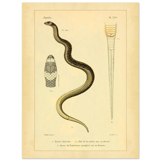 Cette reproduction est issue de l'« Erpétologie générale ou Histoire naturelle complète des reptiles » d'André-Marie-Constant Duméril. Elle présente deux espèces de serpents : la Furina beau-dos, avec une vue de sa tête, et la Trimérésure porphyré, avec une étude de sa queue.