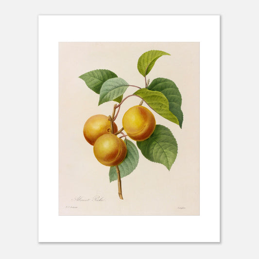 Albaricoque-Melocotón es una delicada representación de esta jugosa fruta, que captura con precisión la textura y el color tanto del albaricoque como del melocotón. Pierre-Joseph Redouté, el renombrado ilustrador botánico del siglo XVIII, demuestra así su inigualable talento en el arte del grabado botánico.