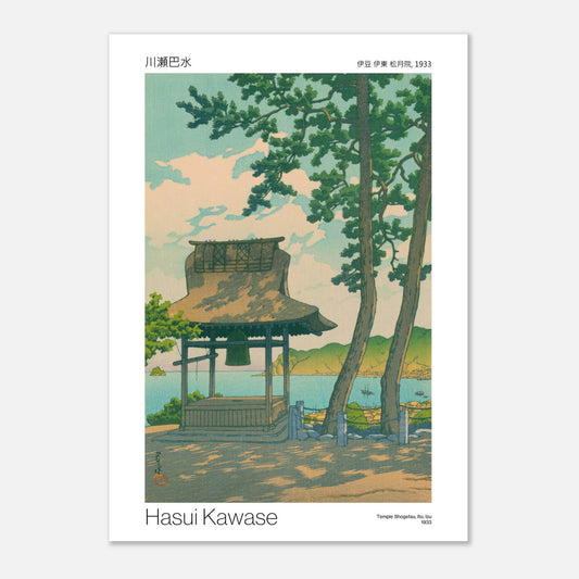 Ilustración de escenas naturales: un recorrido visual por los lugares emblemáticos de Japón: Templo Shogetsu, Ito, Izu, por Hasui Kawase