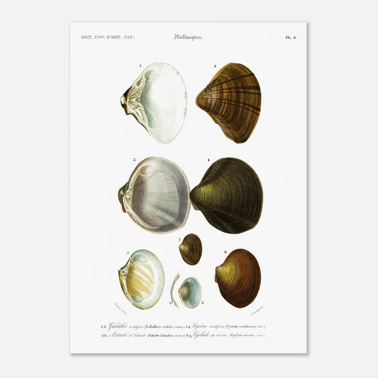 Reproducción de grabado de: Cícladas fluviales (Cyclas rivicola, Lamk.), Cirene cordiforme (Cyrena cordiformis, Desh.), Galathea radiata (Galathea radiata, Lamk.), Astarte islandica (Astarte islandica, Desh.)
